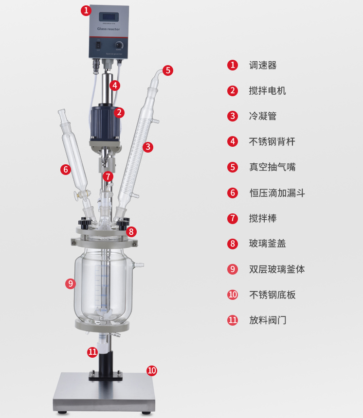 本机具有电动恒速搅拌系统、冷凝、滴加系统,釜体夹层需外接加热或制冷的循环设备。在搅拌物料的同时,通过夹层注入循环的热溶液或冷却液,对釜内的物料进行恒温的加热或制冷。物料进行加热反应时,在真空条件下可以提高蒸发效率(需连接真空装置),溶媒蒸汽经玻璃冷凝盘管时冷却成液体(需连接冷却装置),可回流到釜内,也可通过回流弯头下部阀门进行回收。反应完毕,物料可从釜底的侧出料口放出。